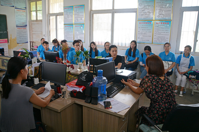 7月12日,在经过两天的实践活动后,河南师大法学院团委书记马淑明带领法学院的“心匙之家·用爱筑梦”实践调研团和“绿色长城·环境保护”宣讲团所有队员一同与原阳县阳阿乡梁寨小学校长王艳红就暑期志愿支教工作作进一步交流。