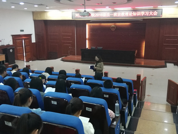 为深入贯彻彻落实党的十九大精神,以习近平新时代中国特色社会主义思想为指导。 10月10日下午,法学院2016级在模拟法庭召开宗教理论知识学习大会。法学院团委书记兼2016级辅导员马淑明、2016级兼职辅导员褚畅和2016级全体同学参加了会议,会议由褚畅主持。