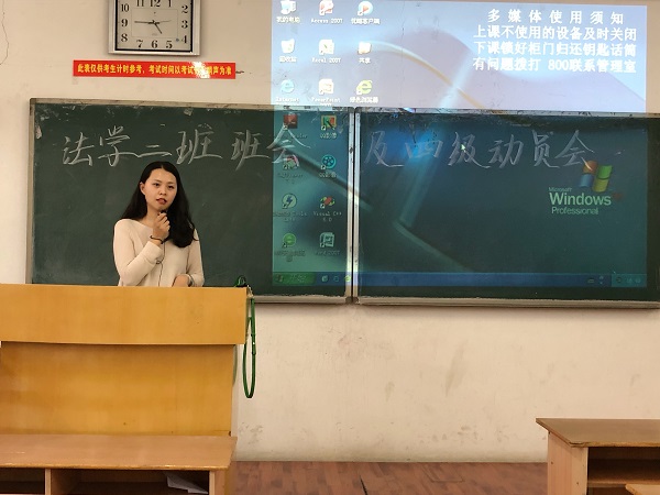 为对近期班级活动进行总结,规划部署下一阶段的工作,建设更加积极向上、团结友爱的班集体,法学二班全体同学于6月5日下午四点四十五分在东教一401室召开班会,本次会议由辅导员康东书主持。