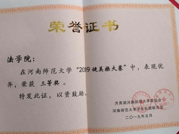 5月19日下午,河南师范大学以“春回大地新时代,舞动青春绚风采”为主题的健美操大赛在我校西区田径场激情上演。我院健美操队积极参加了本次比赛,经过前期精心的组织选拔和激烈的赛场角逐,我院荣获大赛三等奖。