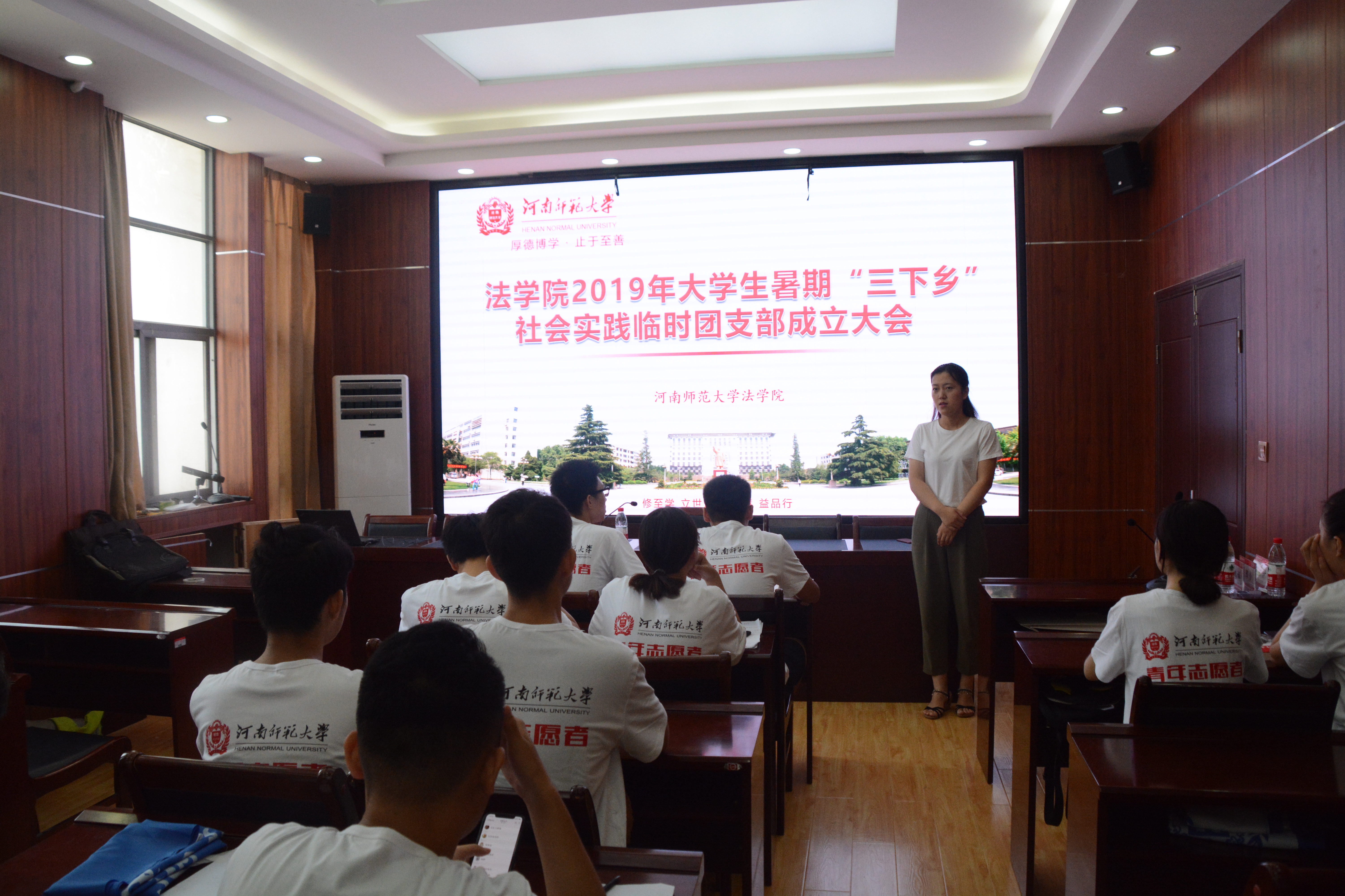 大会在庄严的中国共青团团歌中拉开帷幕。马淑明为大家讲述了关于成立临时团支部的重要性和必要性。她指出,成立暑期“三下乡”社会实践临时团支部是党旗所向,加强了对青年学生的思想引领作用;坚定了各个实践队员的理想信念,带领同学更加深入基层、贴近群众。她希望此次暑期社会实践能帮助同学们坚定理想、锤炼品格、磨练意志、增长本领;希望同学们注重身体力行,从小事做起,用自己的实际行动服务群众、奉献社会,争当向上向善好青年。大会最后,全体成员进行了中国共青团入团誓言宣读,马淑明宣布法学院2019年大学生暑期“三下乡”社会实践临时团支部正式成立。
