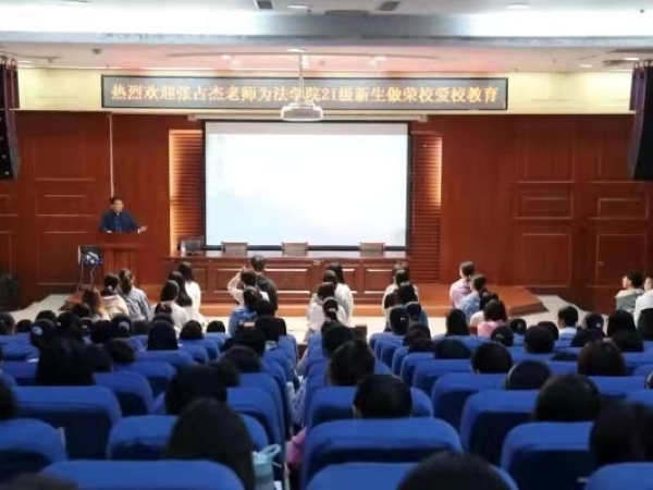 为增强2021级新生对于学校的了解,帮助新同学们找准在大学的发展方向,更快适应大学生活,10月15日,法学院于模拟法庭开展新生荣校爱校教育活动。法学院国家社科基金获得者张占杰老师担任主讲人,学院2021级辅导员及全体新生参加学习。
