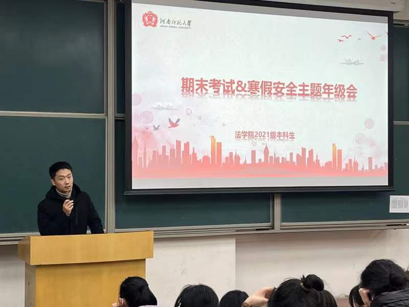 为树立良好的考风考纪,加强法学院学风建设,同时提高学生的安全防范意识,使学生度过一个安全且有意义的假期。12月23日晚,法学院2021级在东区求是中楼202教室,举行期末考试暨寒假安全主题年级会,专兼职辅导员及全体学生参与本次会议。