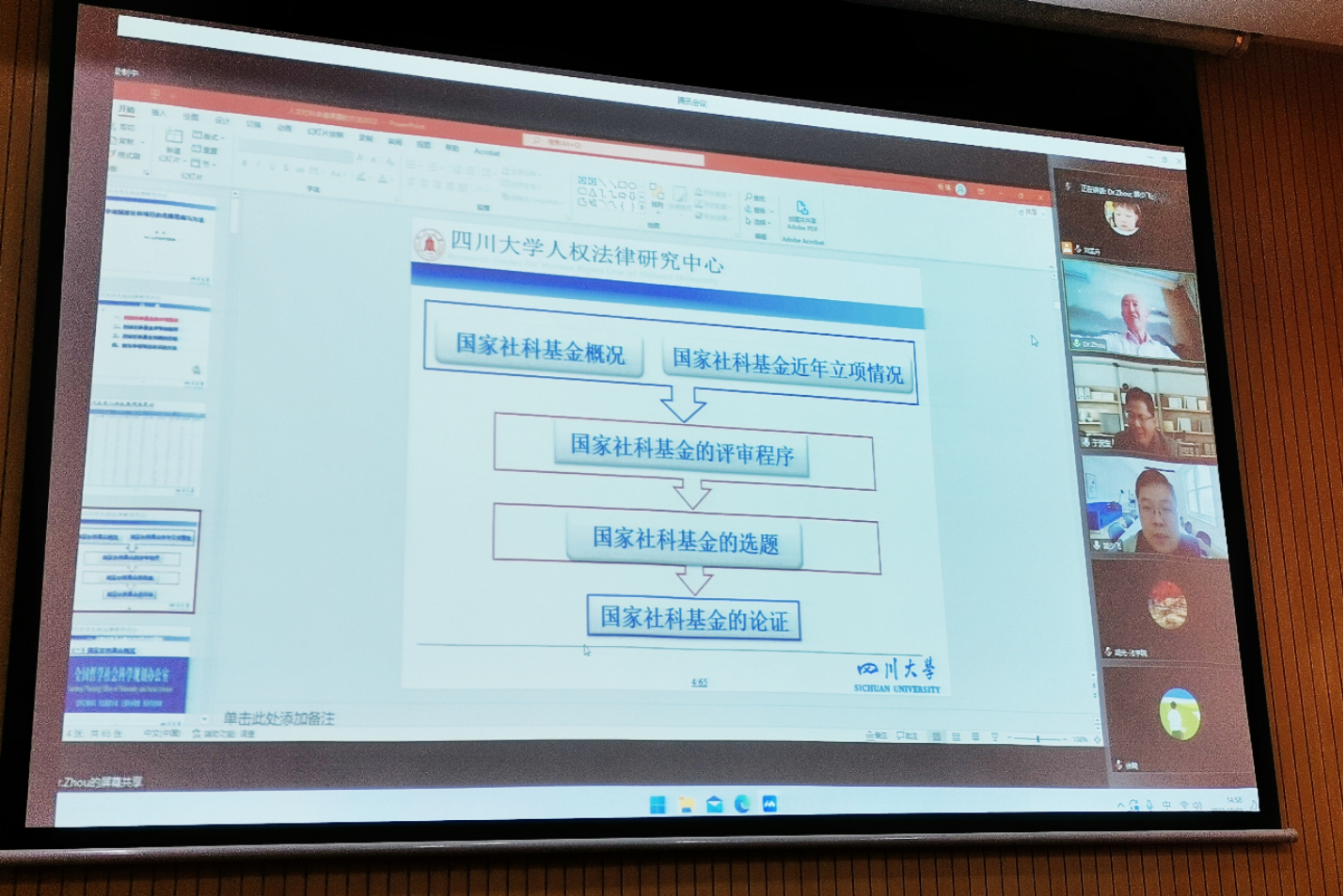 10月22日下午3点,法学院在301会议室召开2023年度国家社科基金选题论证会,四川大学法学院博士生导师周伟教授应邀线上指导,法学院全体申报教师参加。本次会议由法学院副院长郭少飞主持。