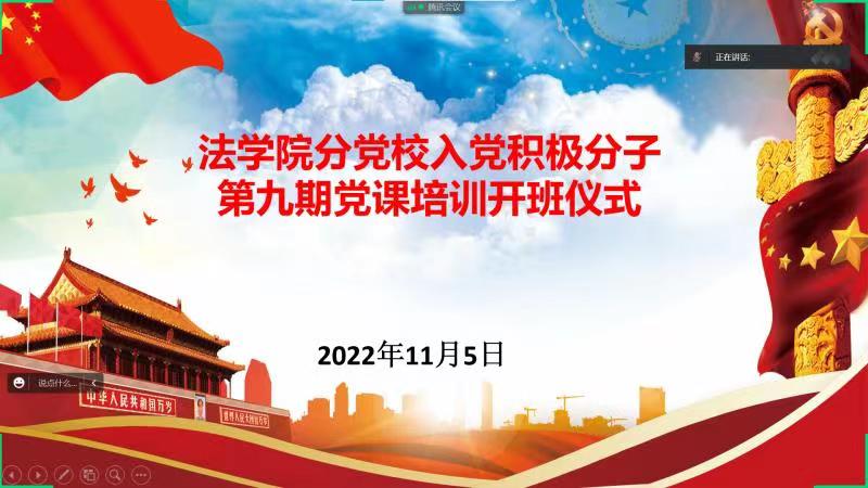 因疫情形势结合校党委的统一部署,法学院分党校第九期入党积极分子培训班开班仪式于2022年11月5日举行。法学院党委书记张壬参加开班仪式,组织员赵东方主持开班仪式。