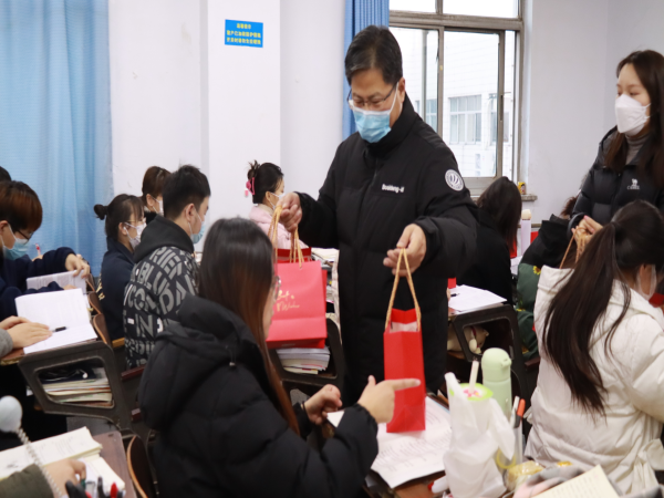 院长于庆生走进考研自习室与同学们进行亲切交流,询问同学们的复习进度、心理状态、身体情况,就学生们当前遇到的问题进行一一解答,同时为同学们加油打气,叮嘱学生们稳住心态,有始有终,以自己所学的知识考出最好的成绩。随后,老师们为备战考研的同学送去了暖心大礼包:金榜题名“福袋”、暖冬“暖宝宝”、心想事“橙”、旺仔牛奶糖,寓意深刻,饱含全院上下对考研学子的殷切祝福和期待,驱散冬日的寒冷,为同学们送去温暖。