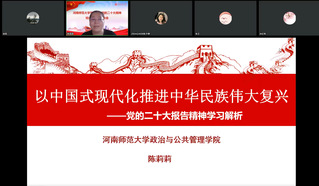 陈莉莉以“以中国式现代化推进中华民族伟大复兴 —— 党的二十大报告精神学习解析”为主题,围绕“马克思主义中国化时代化的新境界”“新时代新阶段中国共产党的中心任务”“构建发展格局,推动经济高质量发展”三个主要方面,详细阐述了坚持“两个结合”,推进马克思主义中国化时代化的历史成就、重大意义、内在要求、现实路径、重要原则,解读了习近平新时代中国特色社会主义思想的主要内容;重点分析了我国从工业化到现代化、四个现代化、社会主义现代化、中国式现代化的发展历程,解释了中国式现代化的重要特征、本质要求和内涵以及战略安排;进一步讲解了如何以创新、协调、绿色、开放、共享为新的发展理念,推动我国经济高质量发展。