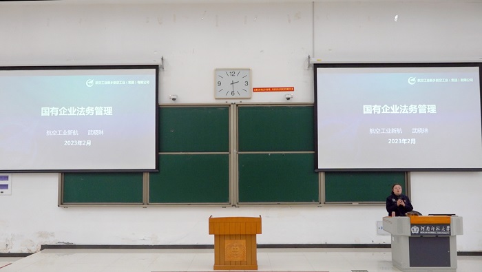 为加强学生对企业法律顾问的认识和了解,2023年2月28日河南师范大学法学院邀请新乡市航空工业(集团)有限公司纪检审计法律部副部长武晓琳,讲授《国有企业法务管理》一课。
