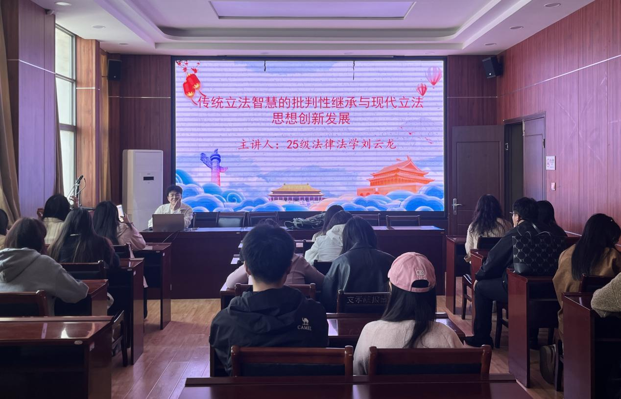 分享中,主讲人刘云龙同学首先以立法指导思想历史演变脉络为核心,梳理了夏商西周奠基期、春秋战国至魏晋南北朝转型期、隋唐成熟期、宋元明清强化期、人民民主政权革新期五大阶段。随后,他剖析了民本思想、礼法合治、慎刑恤罚对现代立法“以人民为中心”等核心思想的深远影响,强调现代立法对传统的批判性继承与创新性发展。最后,参会同学围绕传统伦理与现代法律该如何平衡、道德入法边界在哪里等问题发表观点,展开讨论。