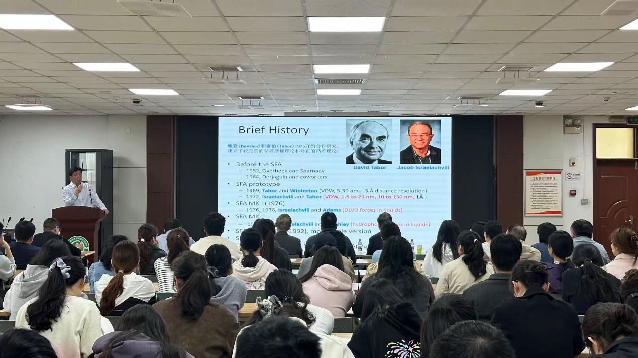 本次报告中,曾宏波院士以“分子间作用力是连接微观世界与宏观工程应用的核心桥梁”为主线,系统阐释了界面科学的发展脉络与关键分子间相互作用的本质的调控机制。他结合自身团队研究成果,从基础理论、表征技术与工程应用三大维度,介绍了其团队开发的表面力仪(SFA)等纳米力学表征技术,解决了界面微观力精准测量的难题,并展示了该领域在功能软材料、能源资源、环境化工等领域的前沿应用,为相关研究提供了理论支撑与技术路径,让与会师生对分子界面科学的工程价值有了全面深刻的认知。
