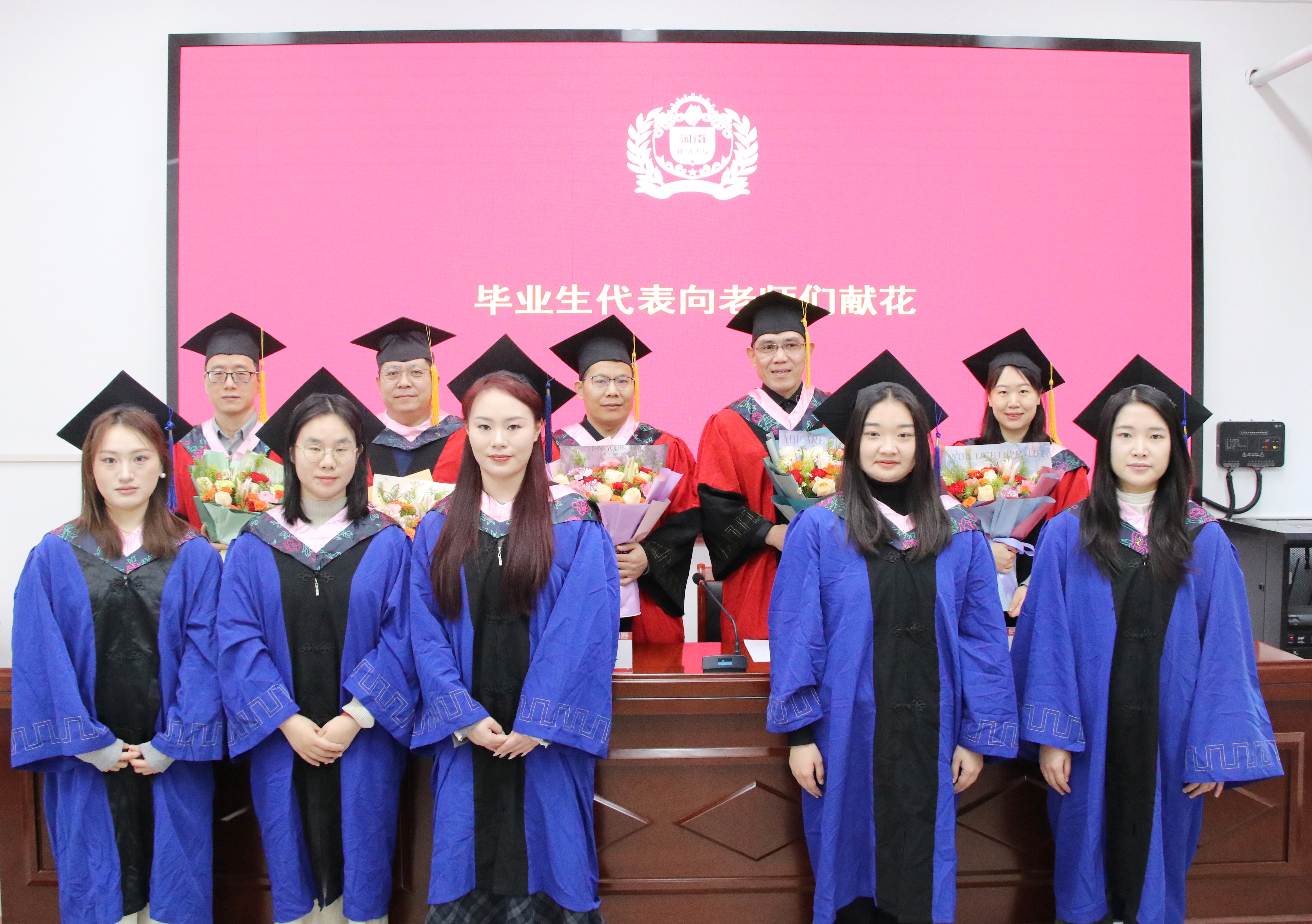 在雄壮的国歌声中,仪式拉开帷幕。学院副院长薛君宣读了《河南师范大学关于授予2025届硕士研究生学位的决定》,随后学院领导班子和导师代表为毕业生拨苏正冠,颁发毕业证书、学位证书。