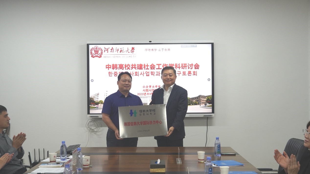 信韩大学副校长郑震京对社会事业学院的热情接待表示感谢,热烈祝贺河南师范大学百年校庆,他表示在与学院的接触中逐渐了解学院理念、专业开设情况,期待后续双方能在社会福利学位点建设、科研教学、师生访学中建立良好的共建机制。会上,郑震京为学院授牌“韩国信韩大学国际协力中心”并委托魏雷东教授担任中心负责人,全权代表河南省同信韩大学展开学术交流。