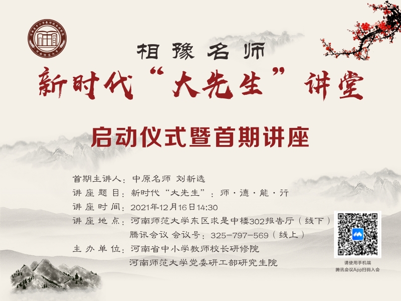 首期讲座由国家“万人计划”教学名师、中原名师、河南师大附中双语国际学校副校长刘新选作《新时代“大先生”:师•德•能•行》的专题报告。现将有关事宜通知如下: