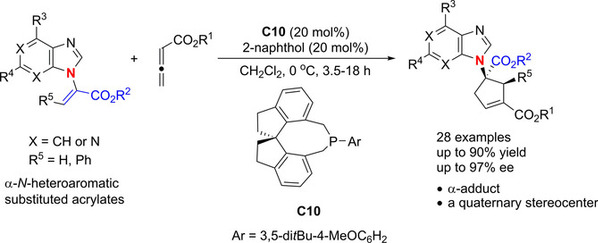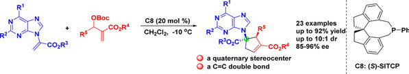 7. Yao-Wei Gao, Hongying Niu, Qi-Ying Zhang, Mingsheng Xie*, Guirong Qu, Haiming Guo*, Regio‐ and Enantioselective [3+2] Cycloaddition of α‐Purine Substituted Acrylates with Allenes: An Approach to Chiral Carbocyclic Nucleosides, Adv. Synth. Catal. 2018, 360(15), 2813-2819.