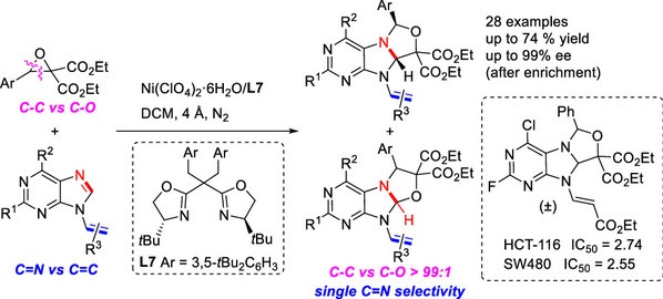 6. Meng-Cheng Zhang, Dong-Chao Wang*, Hai-Ting Wang, Gui-Rong Qu, Hai-Ming Guo*, Highly Chemoselective Synthesis of Purino[3,2-c]oxazoles via the Asymmetric Dearomative [3+2] Cycloaddition of Purines with Donor–Acceptor Oxiranes, Org. Lett. 2022, 24, 41, 7527-7532.