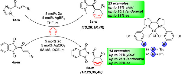 8. , , , , , *, *, *,Fe-BPsalan Complex-Catalyzed Asymmetric [4 + 2] Cycloaddition of Cyclopentadiene with α,β-Unsaturated Heterocycles, J. Org. Chem.2022, 87, 13, 8289–8302.