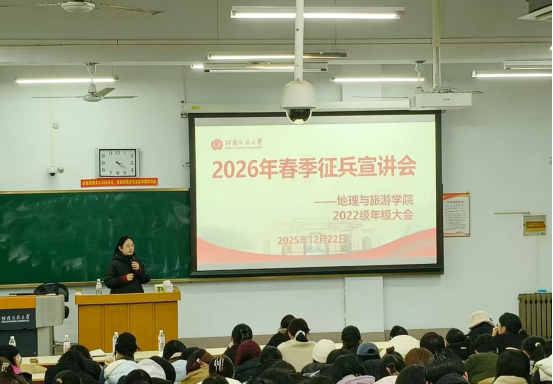 为积极响应国家征兵号召,扎实推进国防教育,引导青年学子厚植家国情怀、勇担时代使命,助力毕业生拓宽就业路径,12月22日下午,地理与旅游学院于新五五四208教室举办2026年春季征兵宣讲会。学院征兵工作专员鲍伟娜、专兼职辅导员以及2022级全体学生参加会议。