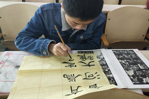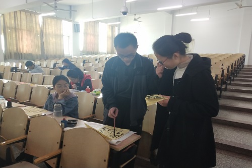 在培训开始前,参赛选手携带比赛所用工具,按时到达培训地点。在负责人介绍完比赛评分细则和注意事项之后,参赛者进入自由练习环节,练习时认真投入。在培训中,指导老师耐心地给予参赛学生技法上的指点,对毛笔字练习中的横、竖、撇、捺等各个笔画的书写要点以及字形结构的搭配等都进行了细致的指导。参赛学生认真听取老师意见,不断完善自己的不足。在培训中,参赛人员得以提升自己的水平并增强自信,培训效果显著。
