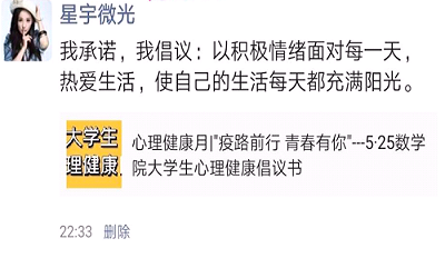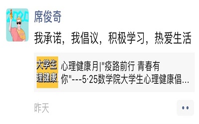 为鼓励学生树立理性平和心态,积极面对疫情期间居家学习生活,数学与信息科学学院于5月25日开展“关爱大学生心理健康倡议书”网络接力活动,学院全体学生参与其中。