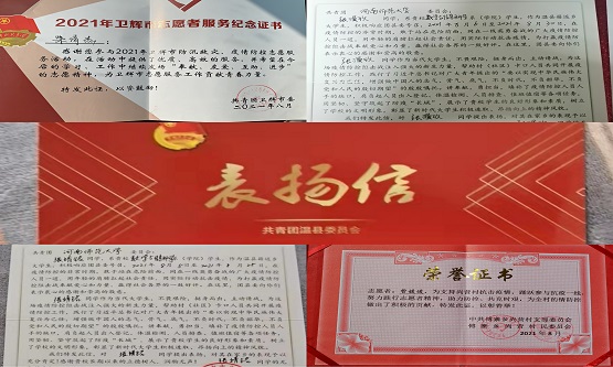 收到抗洪抗疫志愿服务工作感谢信的志愿者共有40余名。其中,正阳县真阳镇街道陈庄社区党支部对2019级本科生胡毓颖表示感谢,感谢她在疫情前期人手不足的情况下,挺身而出,主动请缨,加入到疫情防控工作中。尽管在工作中遇到困难、听到抱怨,胡毓颖仍不退缩,坚持奋战在疫情防控一线,充分展现了当代大学生“把灾难当教材,与祖国共成长”的精神风貌。2021级本科生荆睿收到了来自中共嘉应观乡东营村党支部的感谢信,信中对荆睿“勤勤恳恳工作、积极分担工作、每日坚守工作12小时”的行动进行了高度赞扬。在非常时期,志愿者们用实际行动弘扬了“奉献友爱,互助进步”的志愿精神,尽显学院青年学子的责任担当。