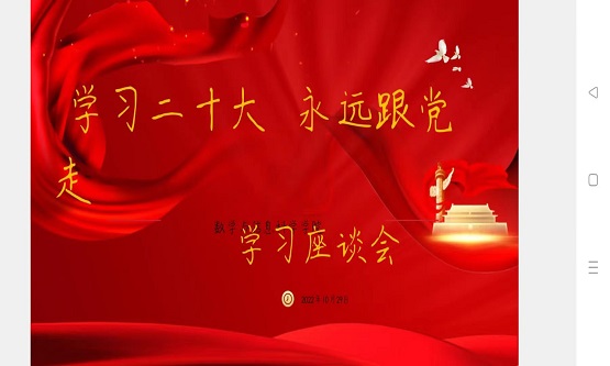 为深入学习贯彻党的二十大会议精神,赓续红色血脉,10月29日下午,数学与信息科学学院于线上举办“学习二十大,永远跟党走”学习座谈会。2021级、2022级各班团支书及部分同学积极参与其中。本次座谈会由柴佳鑫主持。