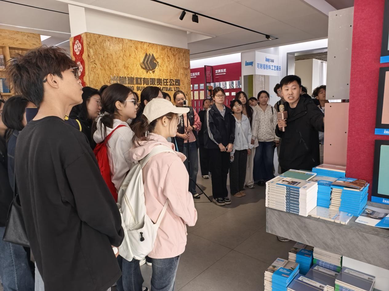 调研过程中,企业技术负责人带领同学们依次参观了产品展示厅、生产加工车间与设计研发中心。在产品展示区,同学们近距离观察了新型环保建材、装饰板材等产品的材质特性、工艺细节与实际应用案例,结合《室内设计原理》《材料与构造》等课堂所学,深入探讨不同建材在空间设计、色彩搭配、质感呈现中的运用逻辑,真切感受到课堂理论与产业实践的紧密关联;在生产车间,技术人员详细讲解了建材从原料加工、工艺打磨到成品检测的全流程,让同学们直观理解了设计理念如何转化为落地产品,深刻体会到“工匠精神”对设计行业的重要意义;在研发中心,校企双方围绕绿色建材创新、空间设计美学与市场需求的适配性展开座谈,企业负责人结合实际项目分享了设计落地中的痛点与解决方案,为同学们的专业学习提供了全新视角。活动最后,团支部组织了“设计赋能美好生活”主题分享会,同学们结合调研所见所感,围绕“如何将专业所长融入国家建设需求”进行讨论,纷纷表示要以严谨的学风锤炼专业本领,用设计智慧服务社会发展,在新时代的征程中勇担青年使命。