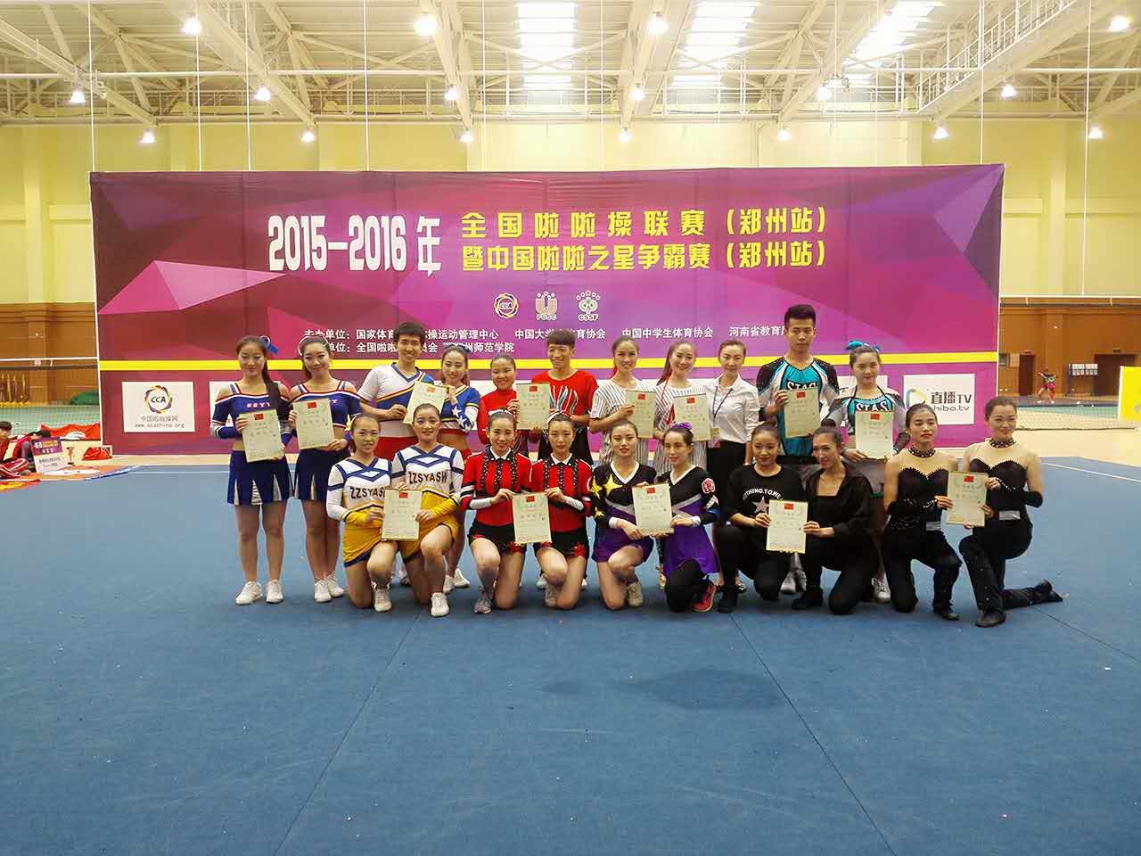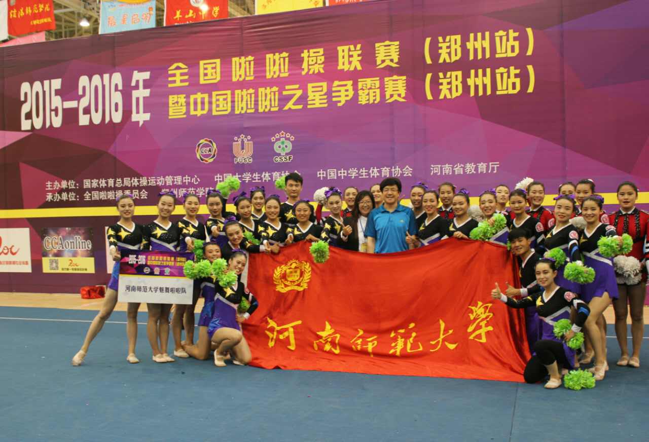 5月31日至6月3日,由国家体育总局体操管理中心、中国健美操协会、河南省教育厅、CFDD全国全民健身操推广委员会主办,河南省学生体育总会健美操协会、郑州师范学院承办的第五届全国全民健身操舞大赛河南赛区暨河南省学生健身操舞锦标赛在郑州师范学院综合训练馆顺利举行,本次大赛共计66支参赛队988名运动员,我校代表队由岳新坡副院长领队,岳晓燕老师任教练共计12名运动员参加了所有4个项目比赛。6月3号到5号由国家体育总局体操运动管理中心、中国大学生体育协会,中国中学生体育协会,中国啦啦操协会CCA主办,河南省学生体育总会健美操协会、郑州师范学院承办的2016年全国啦啦操联赛(郑州站)隆重召开,本次大赛吸引了来自全国大中小学98支代表队近3000人参加了此项盛会。比赛期间,我校党委书记郑邦山莅临现场,为我校运动员加油助威。