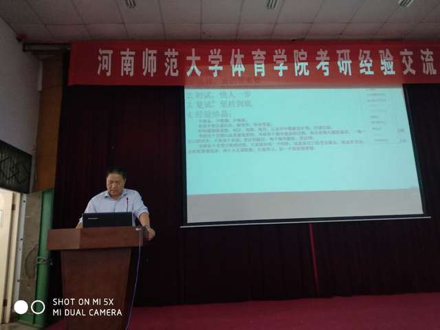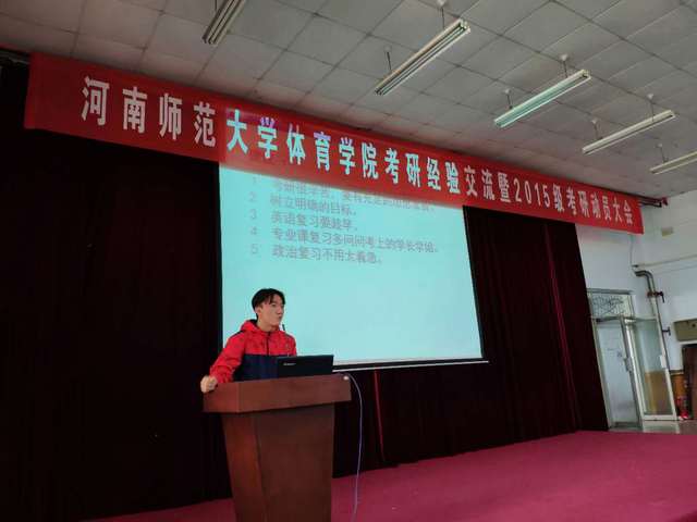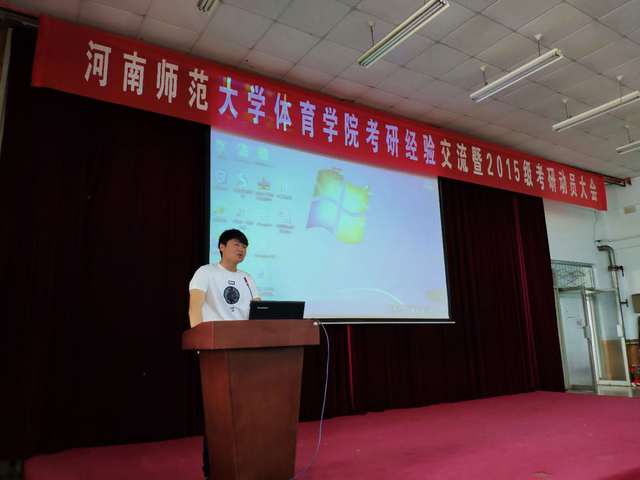 会议伊始,董文可致开场词,他向同学们指出要明确自己考研的动机、了解考研的价值,以自身求学经历为例鼓励学生,给大家提出重要建议。接下来,由四位2014级学生代表依次发言。以优异成绩考入上海体育大学体育教育专业的学生张朝琨,他结合自己的经验给同学们指明考试方向,总结在面试中遇到的一些问题给予解决的方法。2014级体育教育专业的孙永胜和运动训练专业的魏智丰考入首都体育学院,他们依次和大家交流了自己的考研心得和考后体会,用良好的心态去解决遇到的困难。考入华南师范大学运动人体科学专业的马淑慧鼓励同学们要抓住机会、把握目标,对考研前期注意事项比如饮食,交通安全等问题给出建议。