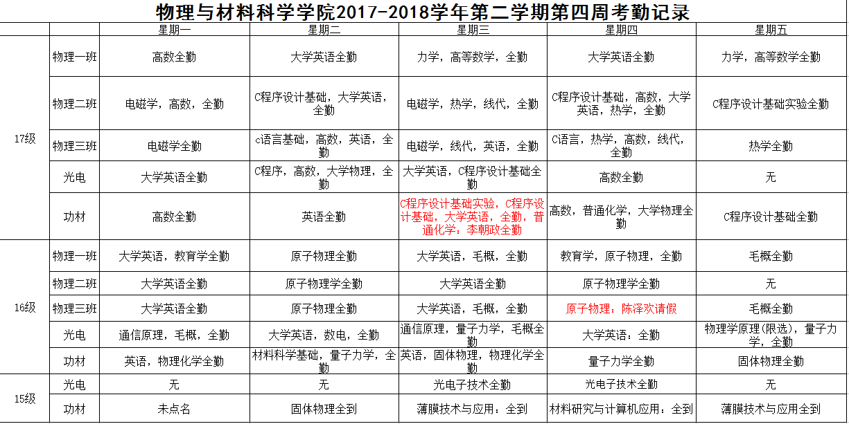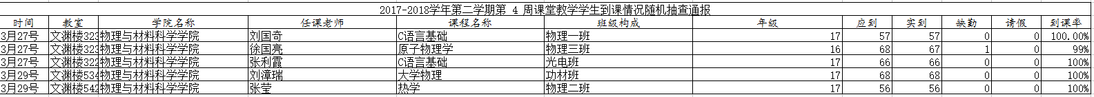 2017-2018学年第二学期第四周考勤记录