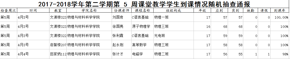 2017-2018学年第二学期第五周课堂教学学生到课情况随机抽查通报