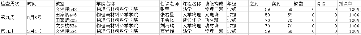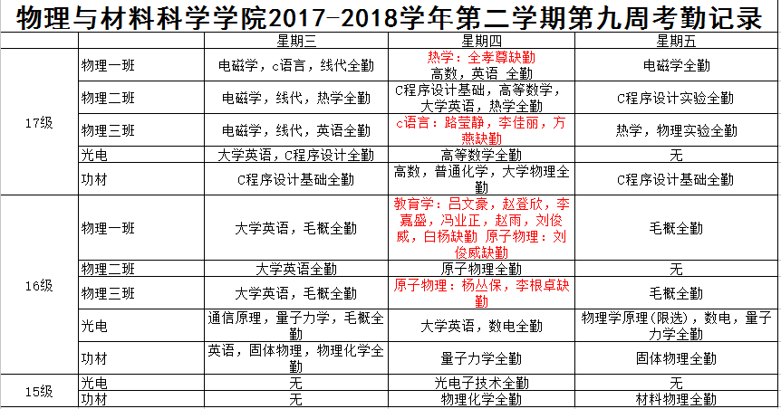 2017-2018学年第二学期第九周考勤记录