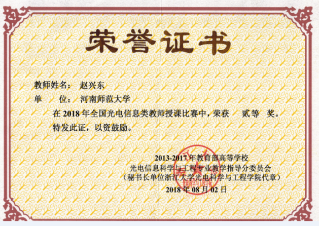 2018年全国高校光电信息类课程教师研修班暨全国光电信息类教师授课比赛由教育部高等学校光电信息科学与工程专业教学指导分委员会(“光电教指分委会”)举办,邀请国内著名高校的知名专家,就光电信息类课程的教学艺术与方法、重点与难点、授课内容组织与实施等问题进行培训、研讨,以提高一线授课教师的业务水平,提高课程的教学质量,来自全国各高校的130余名光电信息专业教师参加了会议和授课比赛。2018年河南省青年教师教学技能竞赛是由河南省教科文卫体工会、河南省教育厅主办,七月开始根据视频资料选出一二三等奖,根据综合评定选出每个学科前六名。决赛由信阳农林学院承办,并在信阳农林学院举行。进入决赛的48名教师分八个大组进行了激烈的角逐。我院青年教师赵兴东老师参加了两次授课比赛并取得了优异的成绩。