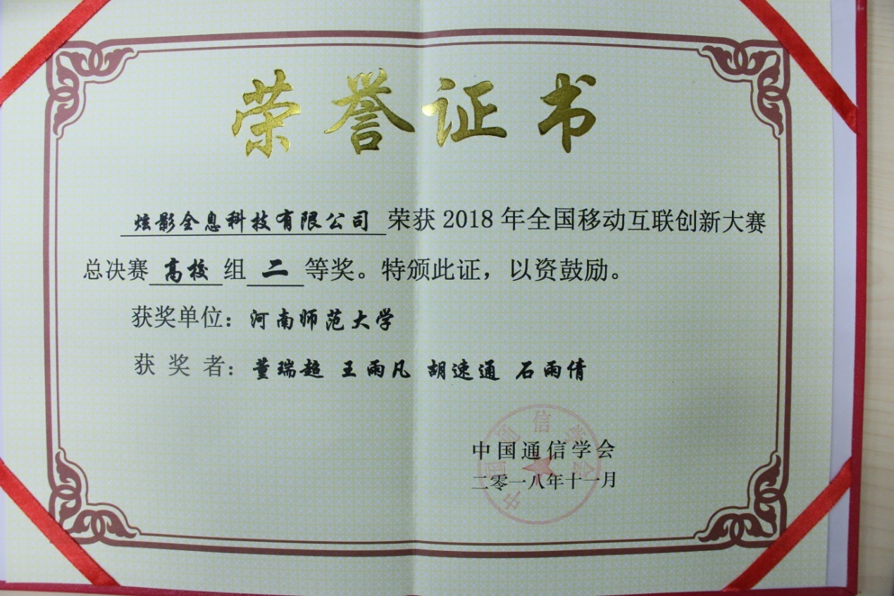 11月11日,2018第四届全国移动互联创新大赛在山东理工大学落下帷幕。总决赛为期三天,来自全国各大高校600多名师生、近百家创新企业、280多个创新创业项目参与了角逐。经过现场答辩、专家评审等环节的激烈比拼,我院秦朝朝、夏世强、王丹云老师指导,董瑞超、王雨凡、胡速通、石雨倩等同学参与的创新创业参赛项目《炫影全息科技有限公司》荣获二等奖。