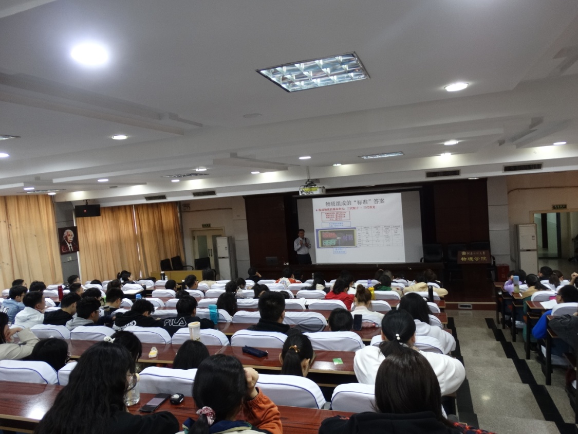 4月21日上午,应我校物理学院邀请,我校杰出校友——中国科学院高能物理研究所李海波研究员在物理南楼学术报告厅以“北京谱仪实验的昨天、今天和明天”为题作了学术报告,学院教师、研究生和本科生200余人参加此次报告会。