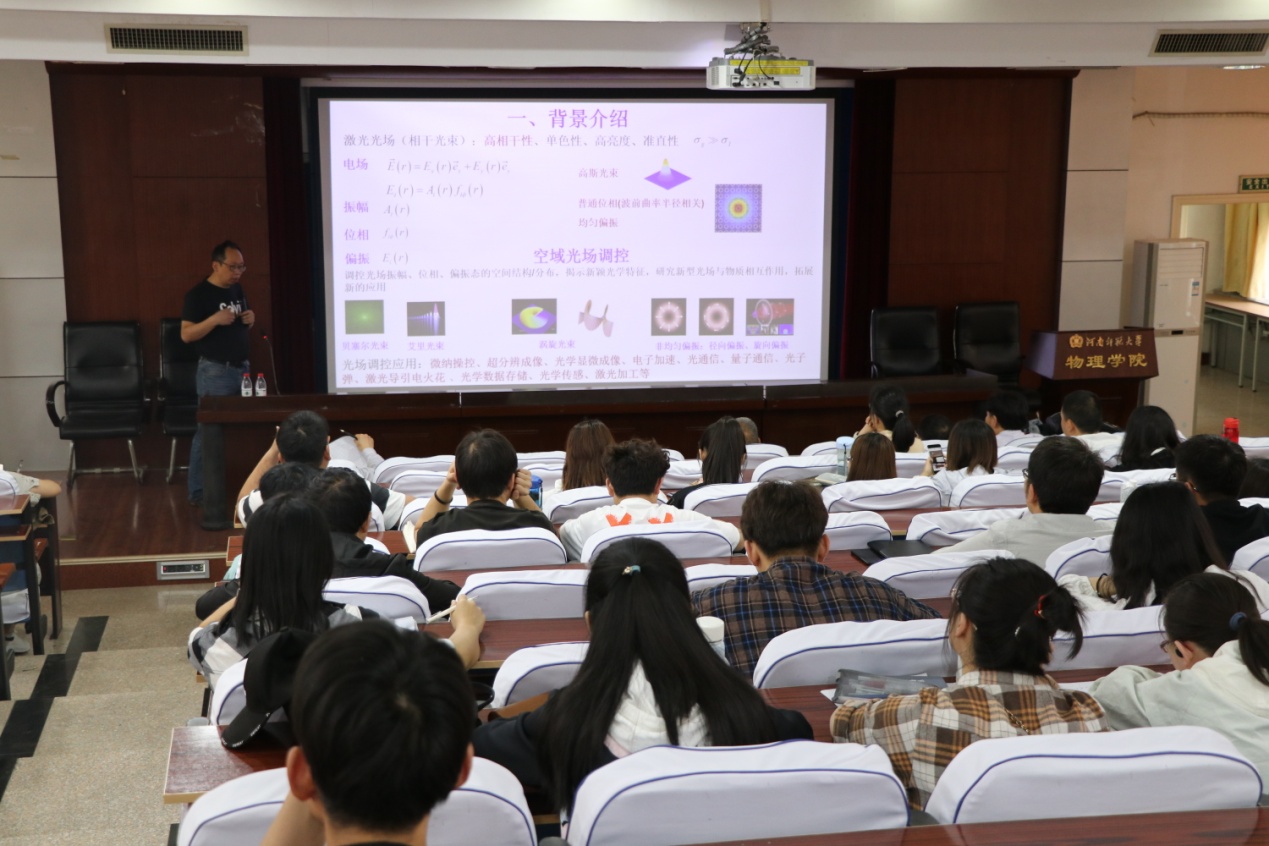 蔡阳健教授以“部分相干光束调控及应用”为题,首先向师生介绍了部分相干光束在大气激光通信、光学成像、微粒操控等领域具有独特的优势。其次简述了部分相干光束在相干调控、偏振调控和位相调控的理论研究和实现方法,并阐明了其重要的应用价值。最后介绍了部分相干光束在激光核聚变、非干涉相位成像、原子光学等各个方向的应用。