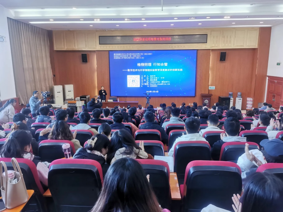 为贯彻落实《河南省师范教育质量提升行动计划》要求,进一步涵养师范生的教师职业道德、增进教育理解、增加专业认知、锻强施教本领、培育专业素养、培养新时代大国良师和豫派名师,我校实施基础教育名师名校长为师范生开设课程与专题报告活动。11月16日下午,我校物理系九七届优秀毕业生、教育部新时代中小学名师培育对象、中原名师、焦作市第十一中学高中物理正高级教师张怀华应邀回校做题为“格物穷理,行知合璧——数字技术与中学物理实验教学深入融合和的创新实践”的专题报告,相关专业师生参加了报告会。