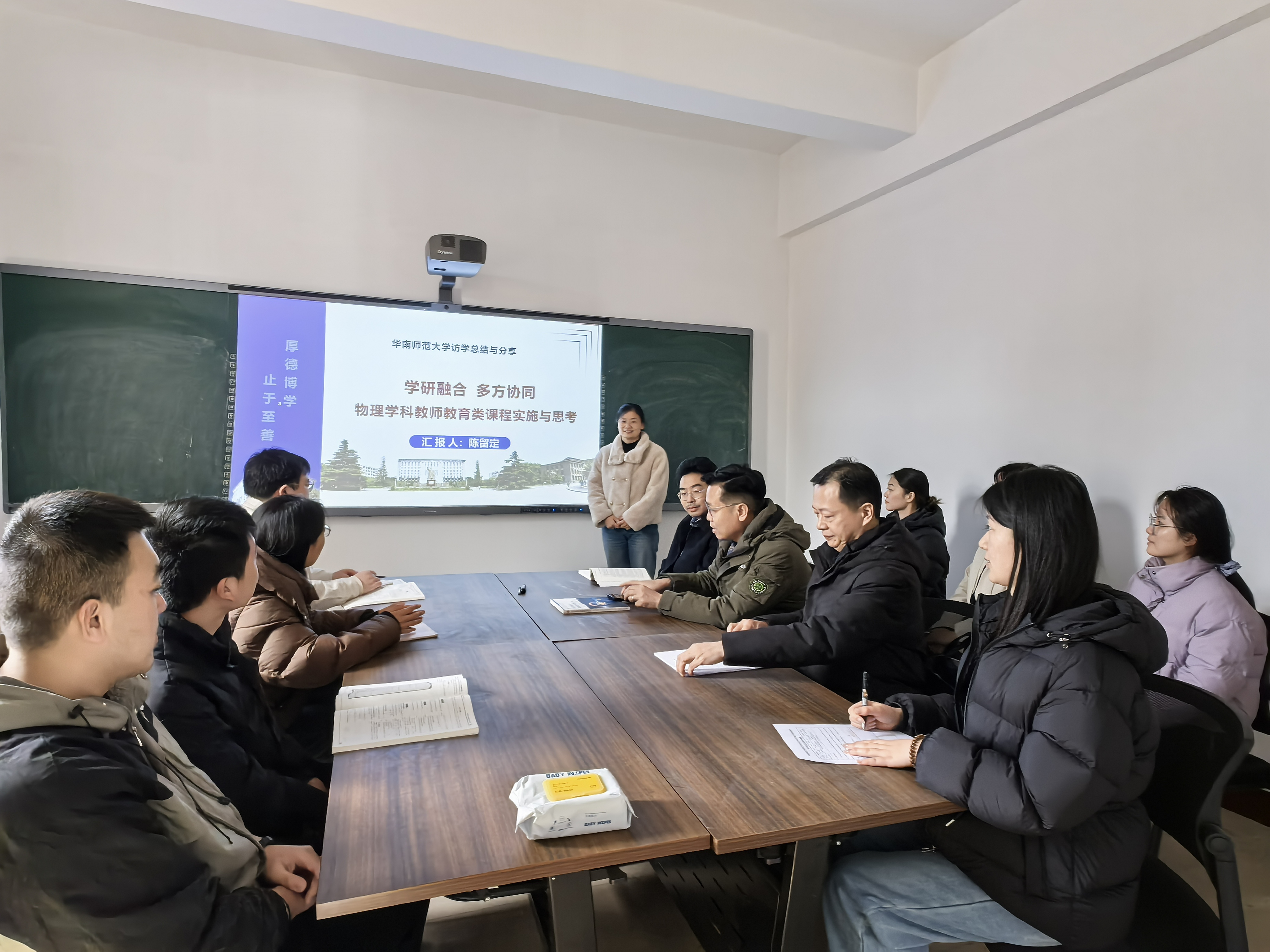 为推动教育部师范教育协同提质计划成果转化与交流,物理学院于2026年3月18日下午,在物理北楼A309研讨室成功举办物理学科教师教育类课程建设与实施专题分享会。我院陈留定老师结合其在华南师范大学的访学经历,开展了题为“学研融合 多方协同——物理学科教师教育类课程实施与思考”的专题分享。物理教育教学研究所的全体老师、部分青年教师、研究生和本科生参加了此次分享会。