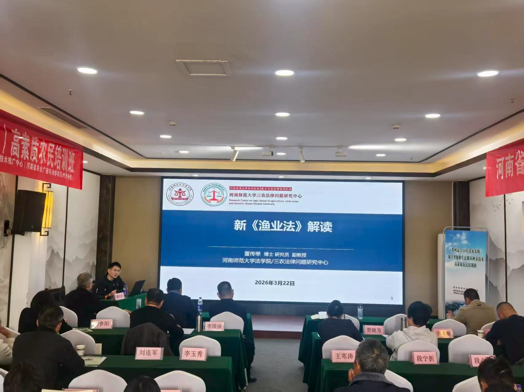 为深入推进乡村人才振兴,加快农业农村现代化建设,培育懂技术、善经营、会管理的高素质农民队伍,2026年3月17日至26日,郑州市淡水养殖(漏斗形池塘生态循环种养技术)高素质农民培训班在中牟县顺利举办。我院三农法律问题研究中心副主任董传举受邀为培训班授课,带来新渔业法专题解读,为水产养殖从业者筑牢法律认知防线。