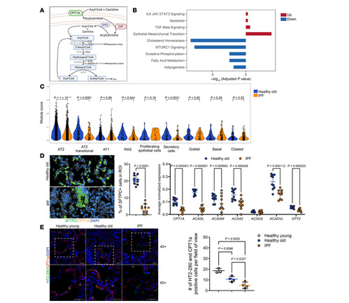 研究团队分析了衰老和IPF过程中肺上皮细胞中脂肪酸氧化酶(FAO)基因的表达情况。单细胞RNA测序显示,IPF患者的AT2细胞中脂质和线粒体代谢相关通路显著下调,且细胞群中FAO基因的表达量从健康老年人肺到IPF肺逐渐降低。空间转录组学证实IPF肺中SFTPC+细胞减少,且FAO基因(如CPT1a、ACADL)在SFTPC+细胞中表达降低。免疫荧光显示,IPF患者AT2细胞(HT2280+)中CPT1a蛋白表达显著低于年轻和健康老年供体。