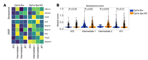 CPT1a缺失会增加处于中间状态细胞的衰老标志物的表达。单细胞测序显示,CPT1a敲除小鼠所有上皮细胞群(AT2、ADI、AT1)中衰老标志物(如Cdkn1a、SASP基因)表达上调,衰老评分显著升高,表明CPT1a的缺失会导致衰老表型的建立。