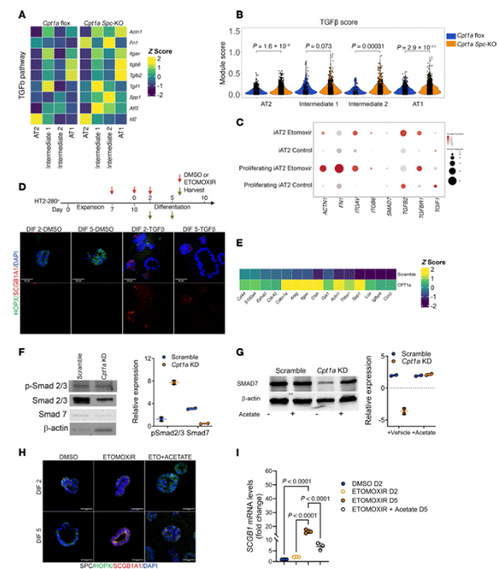 在CPT1a缺陷小鼠(CPT1a Spc-KO)及人类AT2类器官模型中,肺泡上皮细胞(AT2、中间态2和AT1细胞)的TGF-β靶基因(如Tgfb、Serpine1、Fn1)表达显著上调,且单细胞测序显示TGF-β通路激活评分升高。机制上,CPT1a缺失导致脂肪酸氧化(FAO)能力下降,乙酰辅酶A(acetyl-CoA)生成减少,进而抑制TGF-β抑制因子SMAD7的乙酰化修饰。SMAD7乙酰化不足使其泛素化降解增加,导致其蛋白水平下降,解除对SMAD2/3磷酸化的抑制,从而激活TGF-β信号。通过补充乙酸盐恢复乙酰辅酶A水平,可显著恢复SMAD7稳定性,并抑制TGF-β通路活性,降低中间态细胞标志物(KRT8、SCGB1A1)的表达。此外,CPT1a抑制剂etomoxir处理的类器官中,TGF-β诱导的AT2细胞向分泌型中间态分化也被乙酸盐干预逆转。