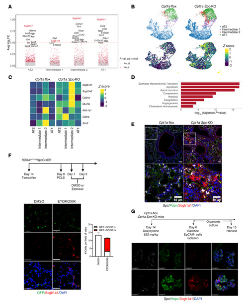 在CPT1a缺陷的AT2细胞中,通过基因表达分析发现分泌细胞标记物Segb1a1基因显著上调。此外,中间2细胞群(Intermediate 2)在CPT1a敲除小鼠中表现出气道分泌细胞的特征,而AT2和ADI细胞标记物的表达较低。同时,这些细胞群在与上皮间质转化(EMT)、缺氧和胆固醇稳态相关的通路中富集,并且糖酵解相关基因表达增加。通过免疫荧光和谱系追踪技术验证了在CPT1a敲除小鼠的肺中,支气管周围和间质区域存在的Scgblal+细胞来源于AT2细胞,而在3D类器官培养中检测到更多的Scgbla1+细胞,进一步支持CPT1a缺陷促进AT2细胞向RAS表型转变的结论。