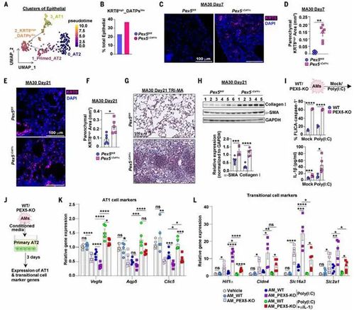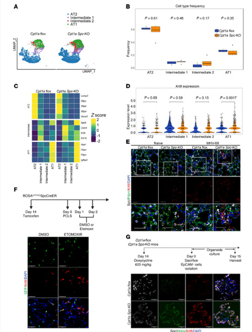 该团队继续研究了CPT1a基因缺失对小鼠肺上皮细胞的影响。单细胞RNA测序结果显示,CPT1a敲除小鼠的肺泡上皮细胞中出现了两种中间细胞群体,其中中间1亚群(Intermediate 1)具有ADI细胞的转录特征,如Krt8、Krt18等。此外,CPT1a缺失导致AT1细胞中Krt8表达显著增加,但AT1细胞的分化标志物Igfbp2也上调。通过免疫荧光和类器官培养实验进一步验证,发现CPT1a缺失促使未受伤和损伤后的肺部出现Krt8+中间态细胞,并且AT2细胞在分化过程中同时表达AT2、AT1和ADI细胞标志物,表明分化异常。