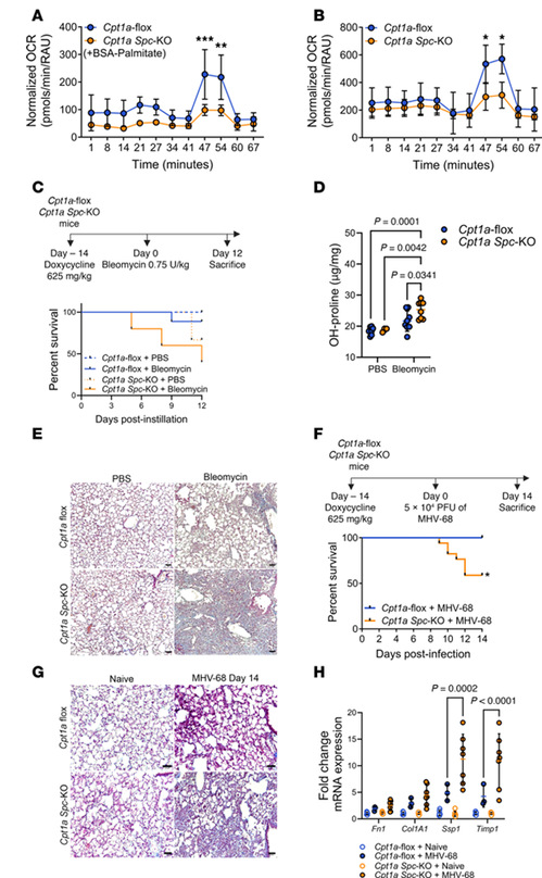 为了探究AT2细胞中FAO缺陷的生理后果,研究团队对CPT1a基因进行了敲除,发现CPT1a敲除小鼠的AT2细胞的FAO能力和线粒体呼吸显著降低。在博来霉素诱导的肺损伤中,CPT1a敲除小鼠死亡率升高,胶原沉积和纤维化标志物显著增加;MHV68病毒感染模型中,CPT1a敲除小鼠同样表现出更高的纤维化评分和促纤维化基因表达,表明在AT2细胞中CPT1a缺乏会导致损伤后更易发生肺纤维化。
