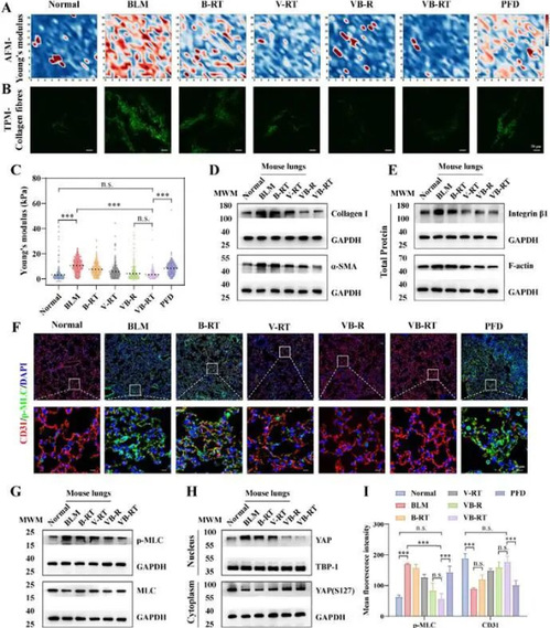为验证 NPs 对机械信号的调节作用,检测纤维化小鼠肺组织力学特性:VB-RT NPs 治疗后,肺组织刚度从 10.56 kPa 降至 3.45 kPa,接近健康肺组织(3.25 kPa);下调整合素 β1、F-actin 和 pMLC 表达,恢复 CD31⁺血管结构;抑制 YAP 核转位,阻断机械传导通路激活,重塑肺组织机械微环境,打破机械-生化信号的恶性循环。
