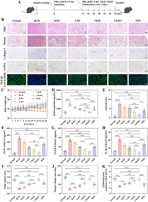在 BLM 诱导纤维化小鼠模型中,评估 VB-RT NPs 的治疗效果:经雾化治疗后,小鼠肺组织肺泡结构破坏减轻,胶原沉积显著减少,α-SMA 和 Collagen I 表达下调;体重恢复至健康水平,肺组织羟脯氨酸含量降低,促纤维化细胞因子(TGF-β、IL-1β)减少,肺功能(潮气量、分钟通气量等)显著改善;且无肝肾功能损伤,安全性优于临床药物吡非尼酮(PFD)。