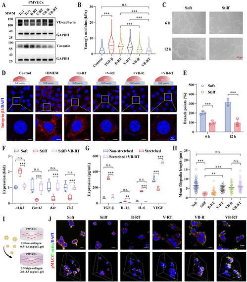 针对 IPF 中内皮细胞异常,研究开展内皮细胞相关体外实验:TGF-β 诱导下,VB-RT NPs 显著抑制 EndMT(上调 VE-cadherin、下调 Vimentin),降低内皮细胞刚度;在刚性基质上,NPs 促进血管管腔形成和丝状伪足延伸,恢复 Tie2、Kdr 等血管相关基因表达;同时减少机械拉伸诱导的 TGF-β、IL-1β 等促纤维化细胞因子分泌,恢复 VEGF 水平,维持内皮细胞正常功能。