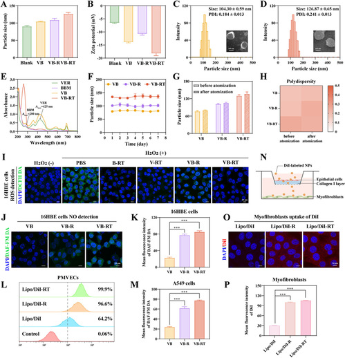 为实现靶向治疗,研究构建了共载维替泊芬(VER)和小檗胺(BBM)、表面修饰单宁酸(TA)和 L-精氨酸的脂质纳米颗粒(VB-RT NPs):表征显示其粒径 126.87±0.65 nm,稳定性良好,雾化后结构不变;TA 修饰可高效清除 ROS 并增强肺靶向性,L-精氨酸诱导 NO 生成激活 MMPs,促进 ECM 降解和 NPs 深层穿透;体外实验证实 NPs 能被成纤维细胞、内皮细胞高效摄取,且 VER 与 BBM 存在协同抗纤维化作用。