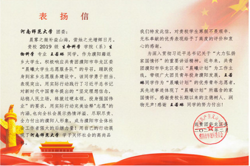近日,共青团濮阳市华龙区委发来表扬信,对生命科学学院2019级生物科学专业学生王若琳在家乡志愿服务建设中的突出表现表达了充分的肯定和衷心的感谢。