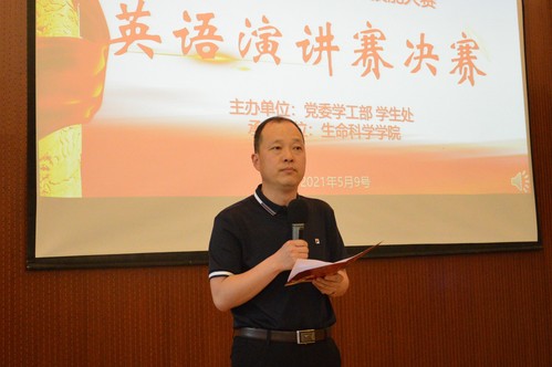 5月9日,由生命科学学院承办的“百年党史峥嵘路,砥砺前行家国情”第二十八届大学生基本技能大赛英语演讲赛决赛在生物报告厅成功举办,党委学生工作部副部长、学生处副处长蒋晋光,生命科学学院党委副书记朱国超,各学院团委书记到场参加活动,本次决赛由外国语学院五位专业老师担任评委,各学院学生代表100余人参加活动。
